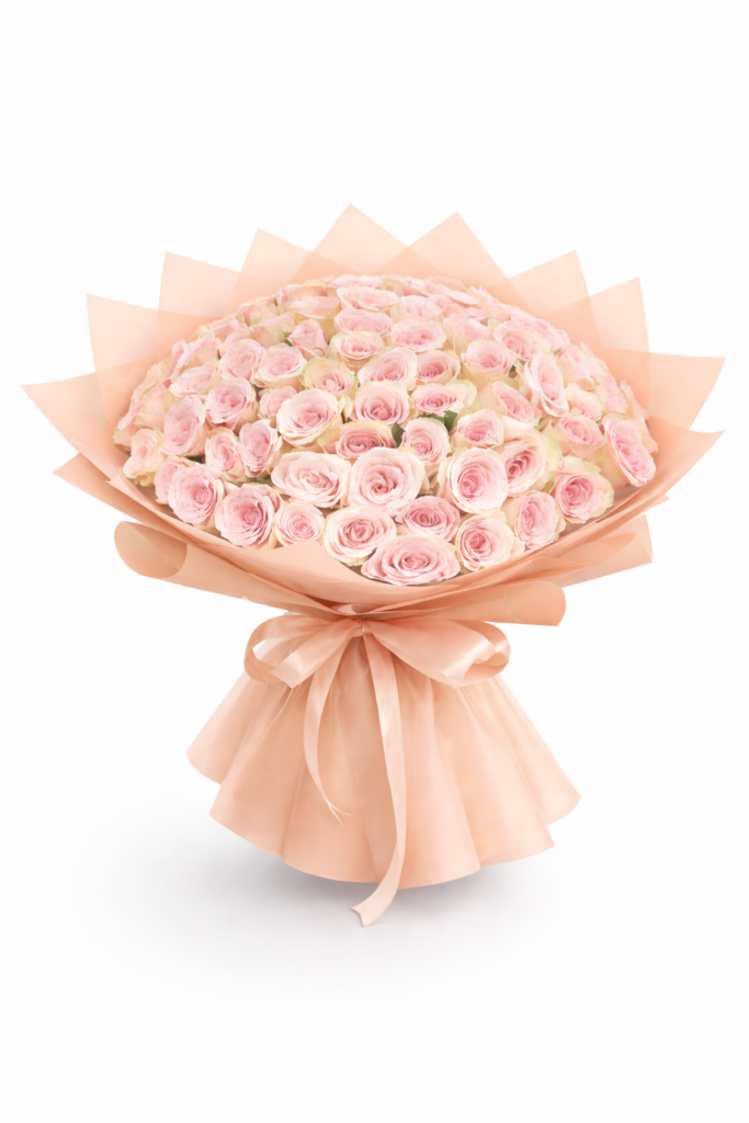 A premium grand pink roses bouquet stands apart through its superior rose quality, generous rose count, and luxury presentation. Each pink rose is carefully selected for freshness, soft blush color, and perfect bloom, then arranged into a full, dome-shaped bouquet that feels rich and abundant.
