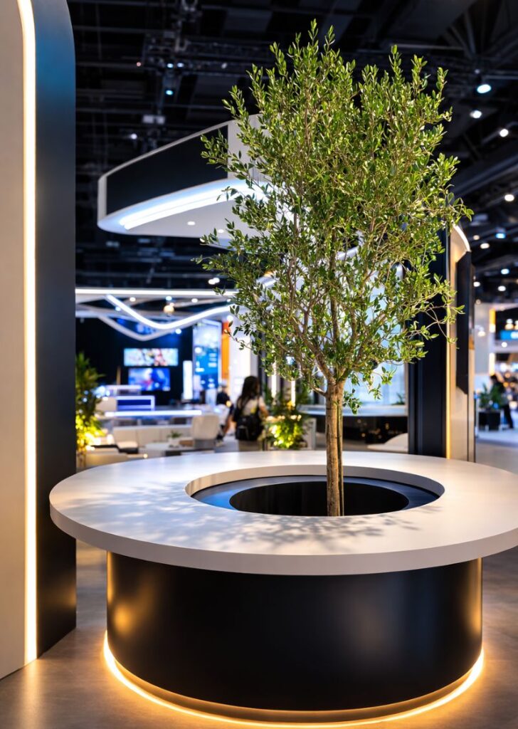 Plants have become an essential component of modern exhibition design. From elegant olive trees to lush tropical palms, greenery transforms ordinary booths into visually stunning displays that attract visitors and enhance brand presence.