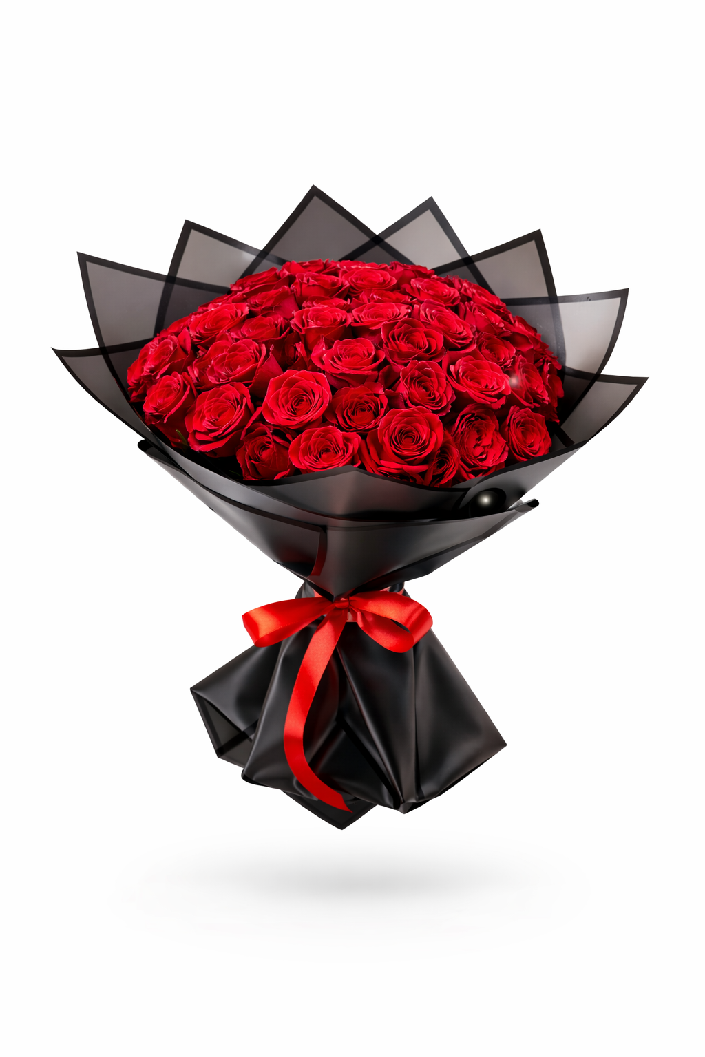 This stunning bouquet features 40 premium fresh red roses, carefully selected for vibrant color, perfect bloom shape, and long-lasting freshness. Wrapped in elegant matte black designer paper and finished with a luxurious satin ribbon, this bouquet represents passion, love, and sophistication.
