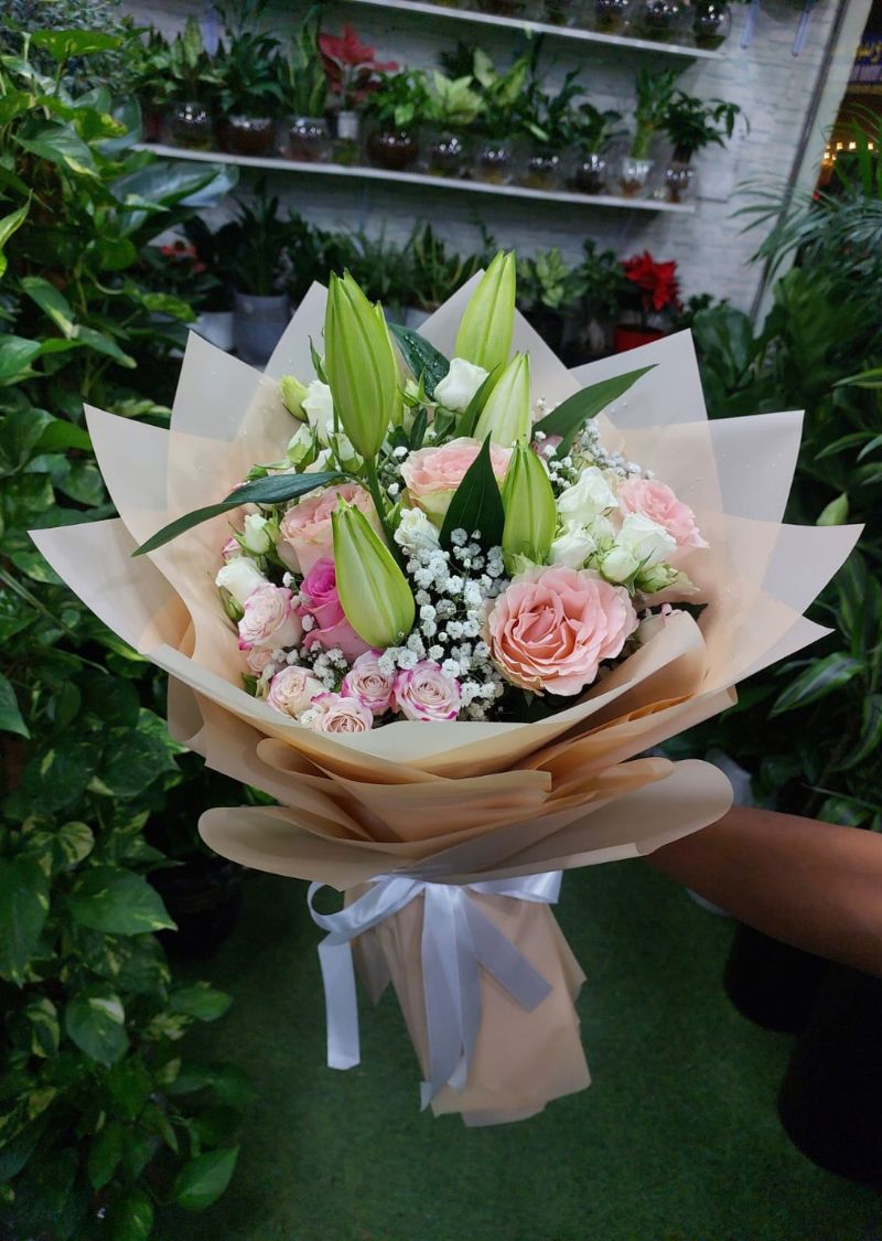 Add a touch of elegance and charm to any special occasion with our Elegant Pink and White Rose Lily Bouquet. This exquisite floral arrangement is crafted with love and care, featuring a stunning combination of: