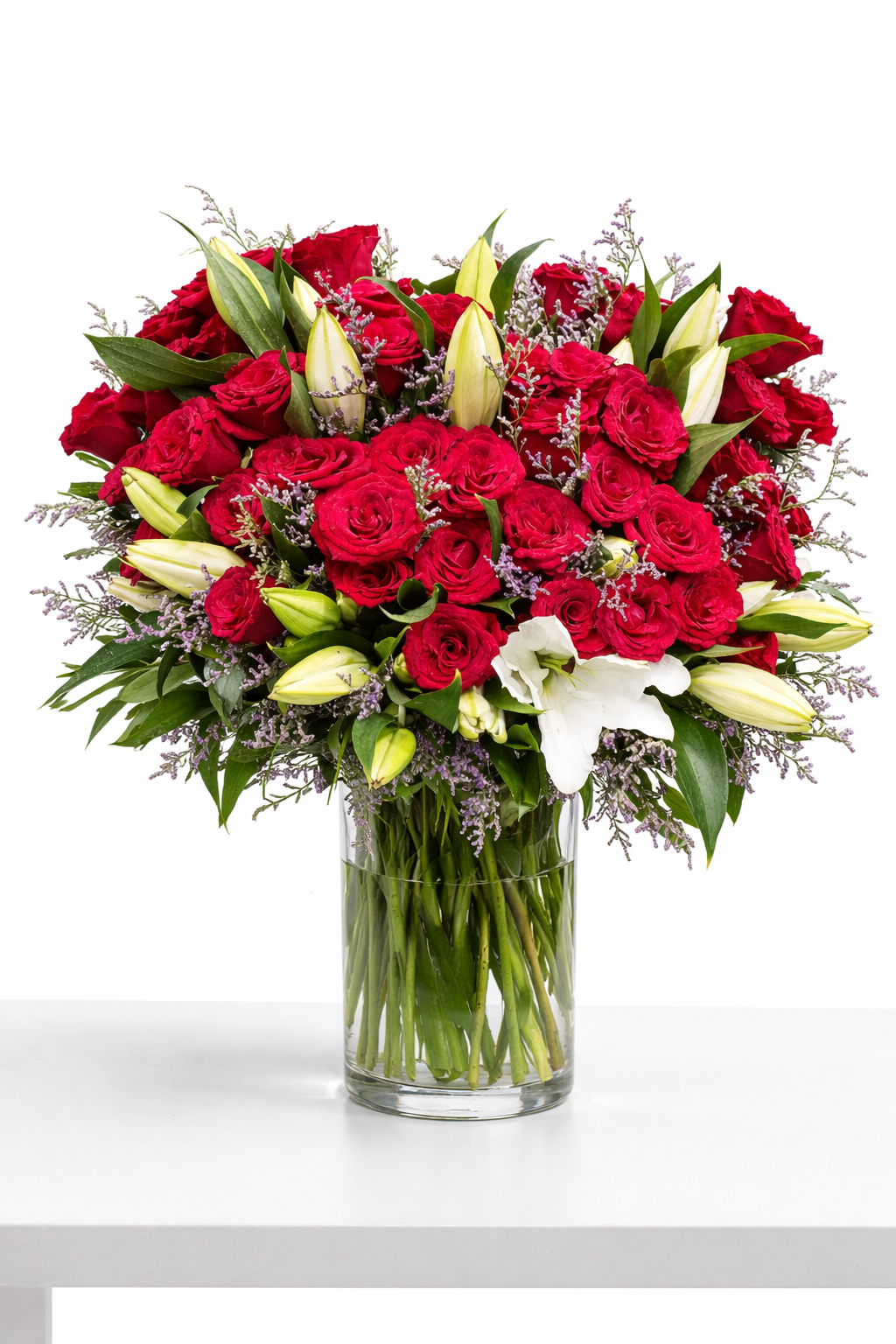 The deep red roses symbolize love and passion, while the white lilies represent purity and sophistication. Together, they create a powerful and elegant flower arrangement suitable for: