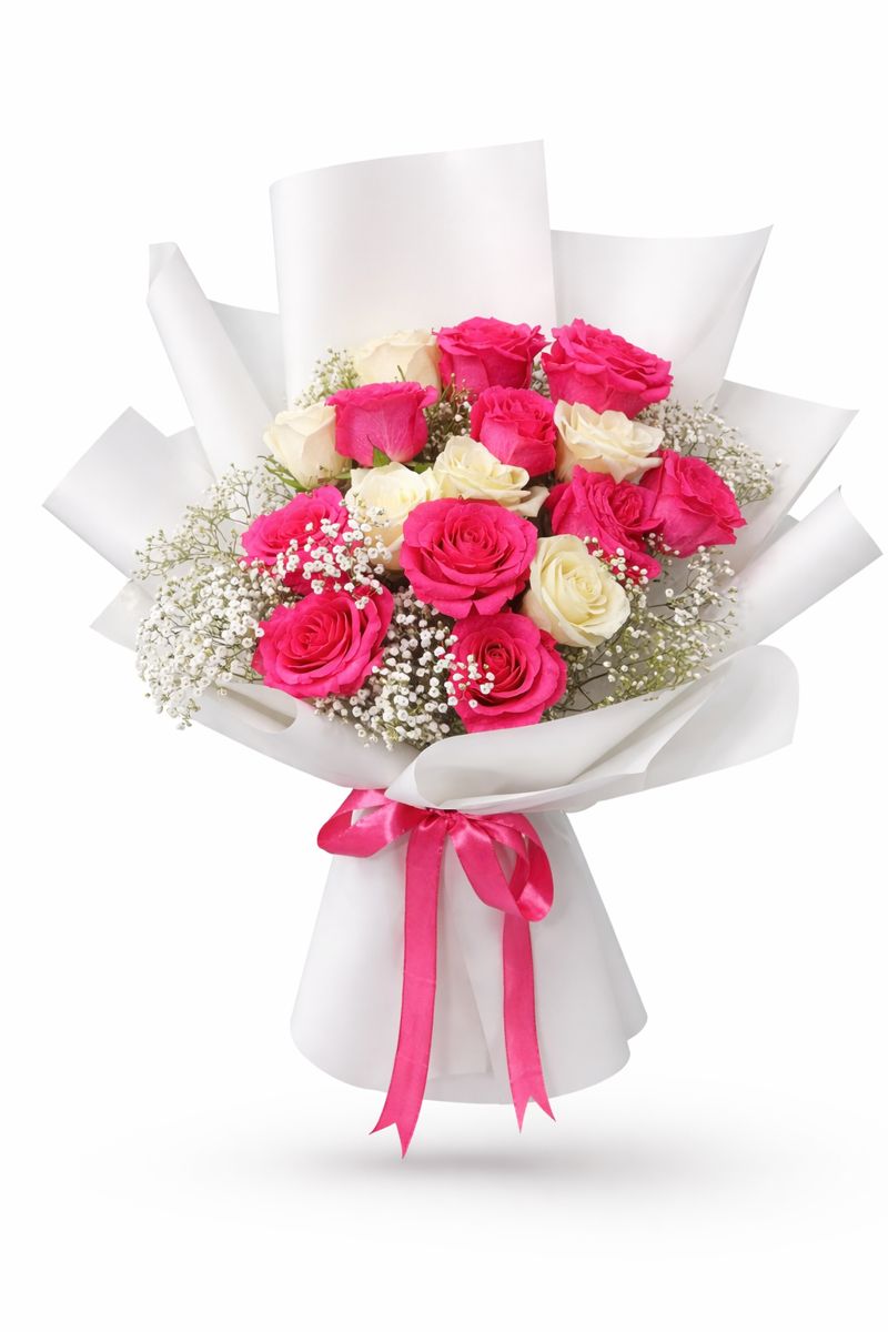 A timeless arrangement of fresh Pink & White rose bouquet beautifully accented with baby’s breath and wrapped in premium white paper. Ideal for elegant gifting, romantic occasions, and luxury flower delivery for any occasion.