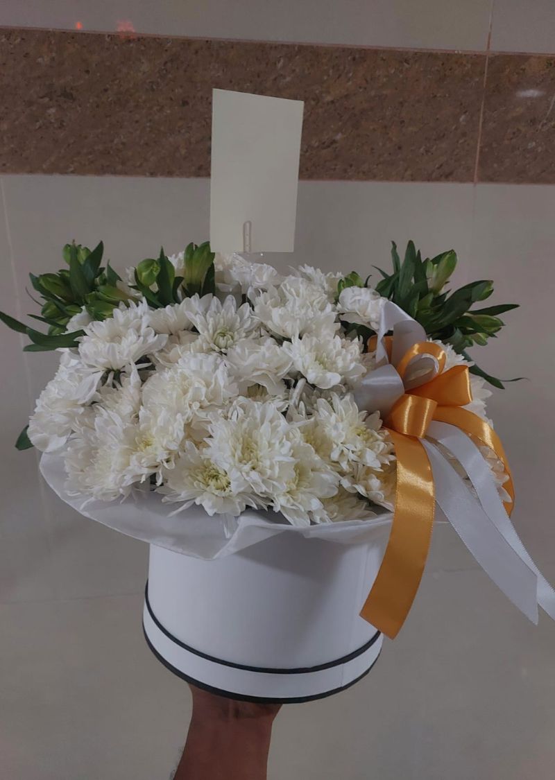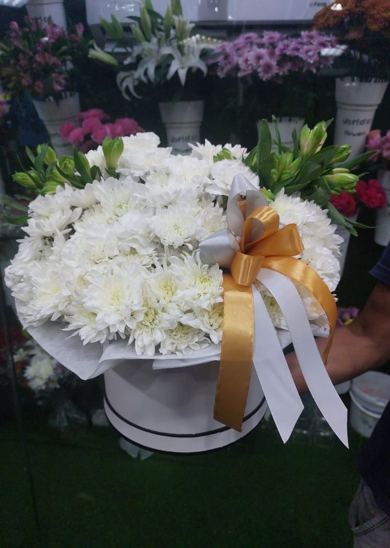 A timeless and elegant white chrysanthemum flower box beautifully arranged in a premium hat box, perfect for birthdays, anniversaries, sympathy, congratulations, or corporate gifting in Dubai. Fresh, stylish, and delivered with care.